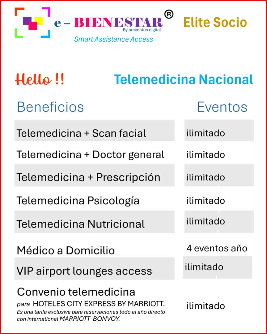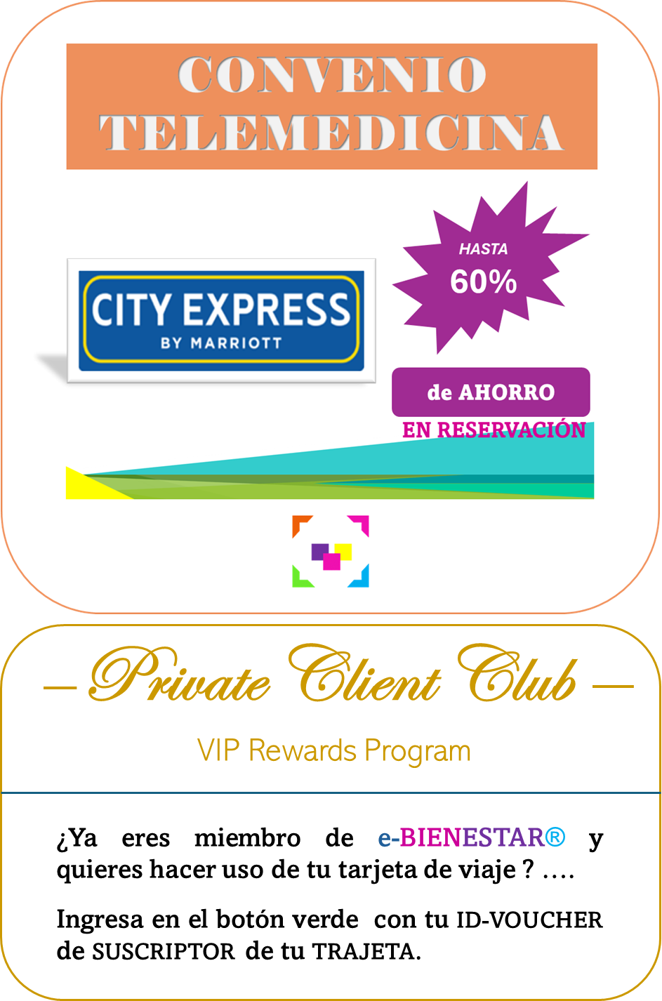 *BONO salud | PROMOCIÓN ESPECIAL: AL realizar una reserva confirmada, con este convenio "TELEMADICINA -CITY EXPRESS BY Marriott", hace válida con nosotros una CORTESÍA DE DESCUENTO del 50% por PAGO ANUAL para la membresía ELITE, durante todo un año, del paquete y SERVICIOS DE TELEMEDICINA VIP.