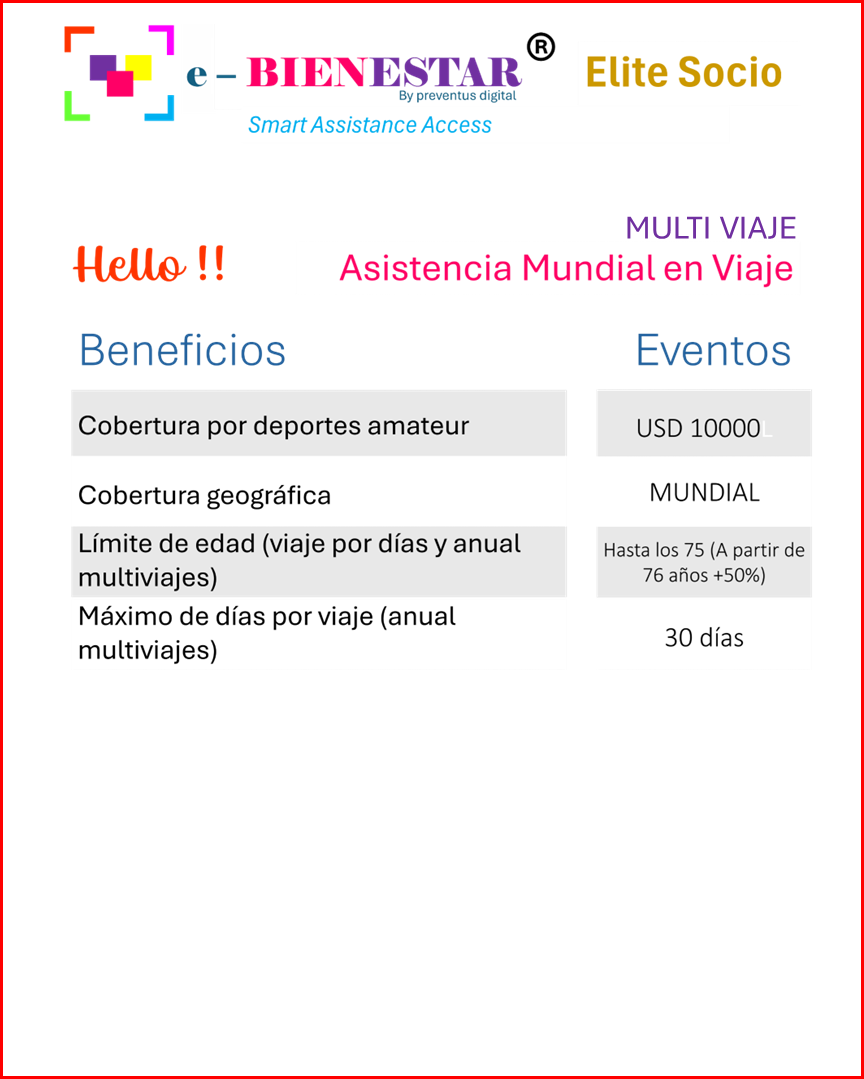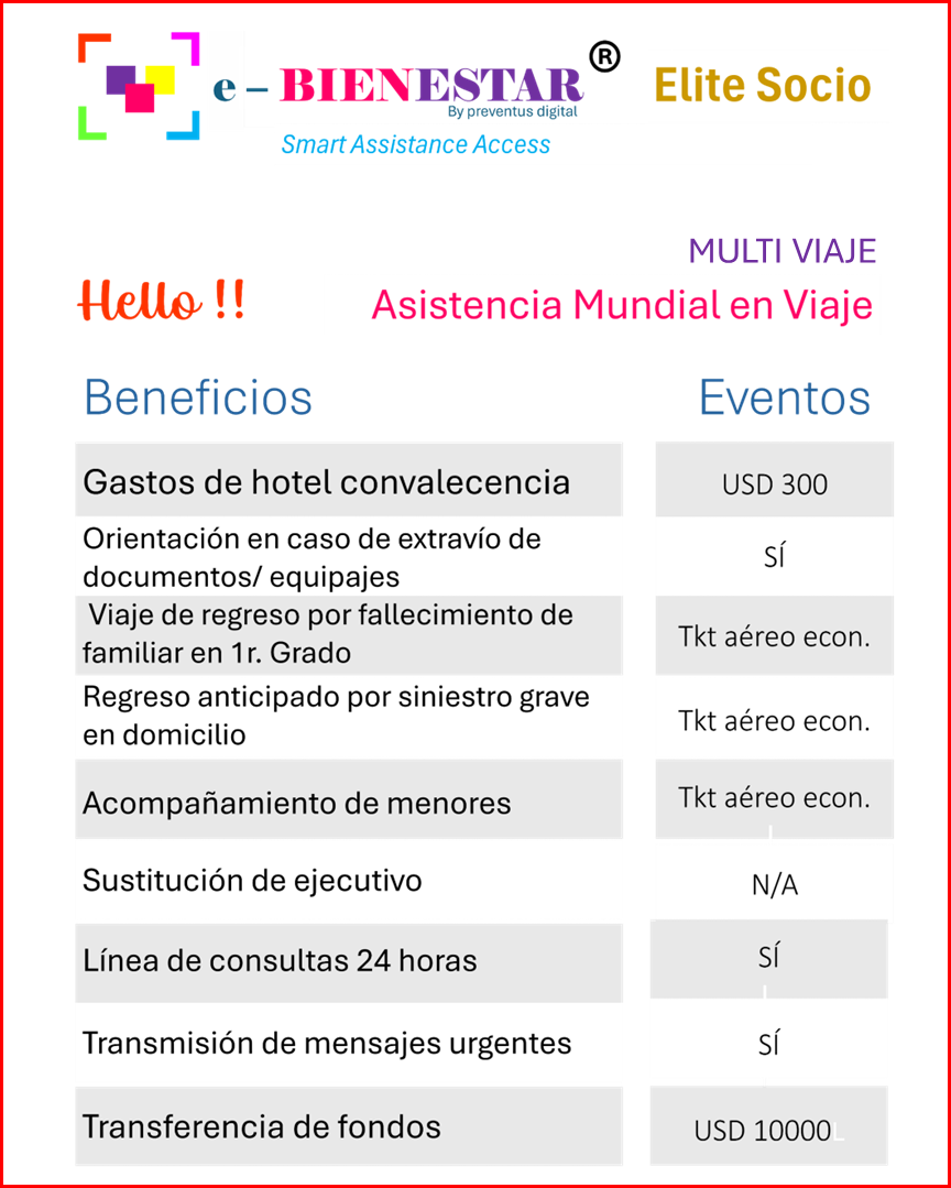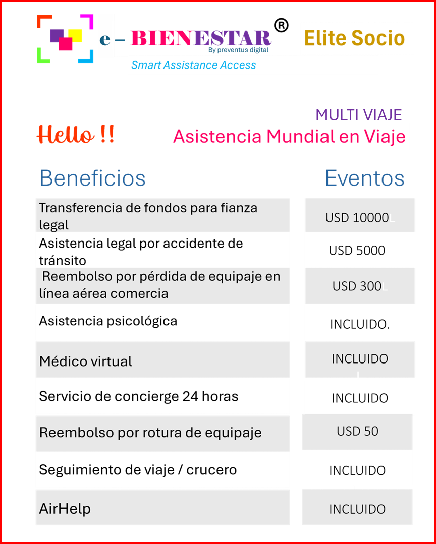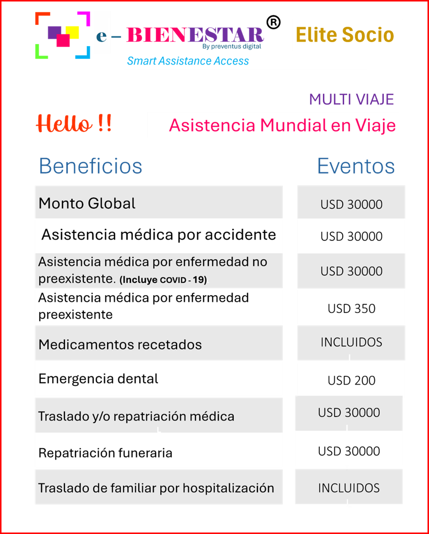 ✓ Cobertura médica financiera de hasta USD 30,000 para gastos médicos sin red de hospitales, libre elección de médico y libre elección de hospital o clínica en cualquier parte del mundo.